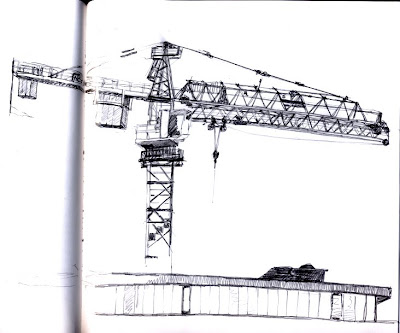 Crane on top of a roof at Sergel's Square, pencil. Drew over the spread....